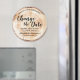 Changement de date pour votre mariage? pas de soucis, envoyez une belle, fraîche et Nouvelle Enregistrer la date annonce avec ces magnets ronds uniques. Doté d'une conception de découpe de disque en bois qui se démarque certainement. "Change la date" dans un script moderne. Même amour, Nouvel anniversaire de Mariage. Ce modèle modifiable vous permet de customiser les mots au besoin. Remplacez le texte par votre propre date de mariage, l'emplacement, les noms de mariée et de mariée, et le site Web du mariage. Les sites web mariages ont été un excellent moyen pour les couples de rester en contact avec leurs invités et de les mettre à jour avec des informations et des instructions. N'hésitez pas à supprimer ce champ si vous n'en avez pas besoin. Le design de disques en bois est parfait pour les styles botaniques, rustiques et chic mariages. Contactez info@lddesignloft.com si vous avez besoin d'aide pour cette conception.