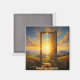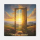Une touche rayonnante qui brille dans des teintes dorées vibrantes, déverrouillant une porte vers un horizon éclairé par le soleil avec des champs verdoyants et un ciel clair.
