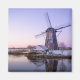 Aimant frigo carré comme souvenir d'un moulin à vent pendant un lever de soleil violet en hiver avec une fine couche de neige et de glace sur l'eau au site du patrimoine mondial de l'UNESCO Kinderdijk dans la Pays-Bas.