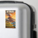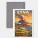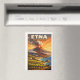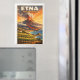 Travel poster featuring Mount Etna, Italy, in a classic retro travel-poster style. Central focus on the smoking volcanic cone rising above lava fields, vineyards, and the Mediterranean coastline of Sicily. Warm sunlight highlights glowing craters and drifting ash clouds, creating a dramatic, powerful atmosphere. Bold color palette of volcanic black, lava red, ash gray, deep blue sea, and golden sky. Clean graphic illustration with subtle vintage grain texture. Bold vintage typography headline: “ETNA – FIRE OF SICILY”. Vertical 2:3 layout, high-resolution, print-ready.