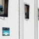 Un noir et un autre blanc Mustache Nettoyer aimant machine à laver sale. Avec de l'eau bleue cool gouttes.