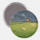 Aimant photo rond avec quelques moutons dans l'herbe verte devant trois moulins à vent sous un ciel sombre avec des nuages de pluie juste avant une tempête de printemps dans un paysage à Leidschendam, les Pays-Bas.