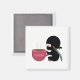 Adorable petite ninja habillée en noir est assise sur des pattes croisées près d'une grande tasse de café vapeur. L'épée katana japonaise est attachée sur le dos.
