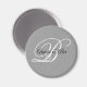 magnets mariages avec un monogramme minimaliste couple dans un script de calligraphie sophistiqué en noir et blanc sur un arrière - plan gris moderne. Pour les noms plus courts, augmentez la taille de police des noms de mariée et de mariée et de leur initiale. Customisez les styles et les couleurs de police de calligraphie moderne... ainsi que la couleur arrière - plan.