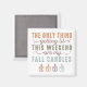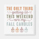 Ce design d'automne humoristique et cosy comprend la phrase spirituelle "La seule chose qui s'illumine ce week-end sont mes bougies d'automne" dans un mélange de polices audacieuses et élégantes. Le texte est aménagé de façon créative avec des tailles et des styles de police différents, ajoutant un intérêt visuel et un ton ludique. La palette de couleurs comprend des teintes chaudes d'automne comme l'orange brûlé, les verts terreux et les marron doux, qui évoquent la chaleur et le confort de la saison.