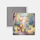Un aimant de Pâques plein de charme et de fantaisie avec une touche personnelle et chaleureuse. Le style aquarelle lui donne une qualité douce et éthérée, et la famille de lapins anthropomorphes ajoute un élément narratif délicieux. L'illustration est faite à la main (aquarelle de Fantabuloustef) parfaite pour envoyer des souhaits chaleureux. Une élégante famille de lapins chasse les oeufs dans la forêt, par une matinée ensoleillée. Dans un beau décor arboré et fleuri, lapin maman, lapin papa et petit lapin marchent les mains dans les mains. Père Rabbit : Sur la gauche, un plus grand lapin habillé d'une veste en costume bronzé et d'une chemise blanche avec une cravate arc rouge. Il tient une corbeille tissée remplie d'oeufs colorés de Pâques. Mère Lapin : Sur la droite, un lapin légèrement plus petit portant une robe bleu clair avec une ceinture bleu foncé autour de la taille et une petite cravate arc rouge. Elle porte aussi un panier d'oeufs de Pâques. Elle a une délicate couronne florale sur la tête. Lapin : Au centre, un petit lapin habillé d’une veste en costume vert et d’une chemise blanche tient la main de son père et marche avec bonheur. Les lapins marchent sur un chemin à travers une forêt. Les arbres aux couleurs douces et muettes donnent un cadre de printemps doux. Le sol est un mélange de brun, de vert et de pourpre, ce qui indique le feuillage et les fleurs. Le tableau présente une technique douce et mélangée d'aquarelle. Les couleurs sont légèrement tamisées, créant une atmosphère onirique et douce. Les coups de pinceau sont visibles dans certains endroits, ajoutant à l'impression artisanale. Cet aimant évoque, le printemps, le renouveau et la chaleur familiale joyeuse d'une chasse aux oeufs de Pâques ! N’oubliez pas de personnaliser le texte en bas à gauche !