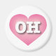 Cet aimant présente un coeur rose calme, cool et recueilli, avec un centre lavé blanc contenant les lettres coques supérieures, blanches et audacieuses OH, l'abréviation officielle pour Ohio, l'état de buckeye.