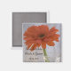 Donnez le ton à vos noces avec le joli Gerber Daisy Orange dans Vase Wedding Save the Date Carré Magnet. Cet élégant mariage fleuri personnalisé garde l'aimant dateur dispose d'une photographie florale d'une fleur de marguerite orange sur la tige dans un vase en verre.