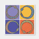 Quatre serpents bleus piquent leurs histoires sur ces carrés de bleu, rouge et orange.