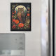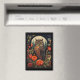Magnet with a cool looking owl with a piercing stare. A full moon in the back with a garden of red flowers.