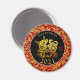 Un aimant frigo rond avec papier traditionnel chinois doré coupé d'un boeuf dans un cercle noir + idéogramme rouge Ox + jaune 2021 et "Année du x" sur rouge foncé avec décoration jaune. Parfait pour le Nouvel An Chinois de l'Ox 2021 ou anniversaire (personnes nées dans l'Ox Year).