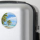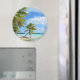Aimant photo souvenir rond avec un palmier suspendu sur une plage de sable blanc d'une île tropicale dans l'océan Pacifique appartenant à l'archipel de Tahiti Polynésie française.