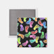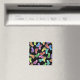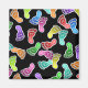 Illustration de nombreuses empreintes colorées avec des visages souriants joyeux qui se baladent contre un arrière - plan noir. Image disponible sur divers cadeaux et produits.