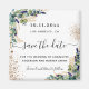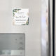 Un mariage branché Save the Date aimant. Un élégant arrière - plan blanc décoré de feuillage d'eucalyptus, de feuillage doré et de poussière de parties scintillant en faux or. Personnalisez et ajoutez une date, des noms et du texte. Le texte : Save the Date est écrit avec un grand script de style à la main tendance avec des swashes.