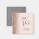 Le bord gauche de cet élégant aimant Save the Date comporte une bordure de parties scintillant en or rose. Le texte personnalisable combine le script d'écriture manuscrite gris charbon avec la police serif sur un arrière - plan rose vif.