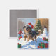 Illustration de vacances pleine de charme avec un chien gai jouant dans la neige, portant un chapeau de Père Noël et entouré de boîtes cadeaux colorées. Dans l'arrière - plan, les enfants construisent un bonhomme de neige à côté d'un sapin de Noël enneigé, créant un merveilleux pays hivernal. Parfait pour répandre la joie des fêtes et capturer la magie de Noël.
