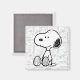 Cette oeuvre Peanuts présente Snoopy assise sur l'arrière - plan de bandes dessinées Charles M. Schulz en noir et blanc.