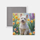 Un chien gai s'installe paisiblement sur une pelouse verdoyante, entourée de fleurs printanières colorées sous un ciel bleu doux. Cette peinture à l'huile numérique saisit un moment de sérénité avec des coups de pinceau expressifs, des couleurs chaudes et un sentiment de joie douce.