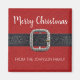 Ceinture à père Noël en noir avec boucle argentée sur combinaison en velours rouge. Joyeux Noël en écriture blanche et un message personnel en blanc sans police.
