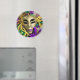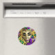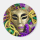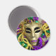 Aimant Mardi Gras aux masques masqués violets et dorés avec plumes et perles.