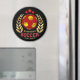 This round magnet is designed to add both personality and visual impact to refrigerators, lockers, and other metal surfaces. It features a bold central ball pattern in rich red and yellow tones, framed by elegant gold laurel branches and accented with star elements for a classic achievement-inspired look. The deep black background enhances contrast and makes the artwork stand out clearly. The magnet offers a customizable text area, allowing it to be personalized for individuals or teams, making it a thoughtful keepsake that combines decorative style with everyday practicality.