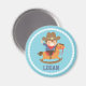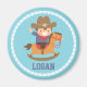 L'aimant avec une bande dessinée d'un petit garçon heureux mignon s'est habillé dans l'équipement occidental de cowboy complet avec le casquette qui a une étoile de shérif. Il monte sur un jouet de cheval de basculage. Grand comme mini cadeau pour les garçons qui aiment des thèmes occidentaux de cowboy ! Personnalisez avec le nom de l'enfant.