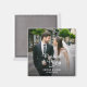 Commémorez le premier Noël du couple en tant que couple marié avec cet aimant carré pour photo de Noël des jeunes mariés "Mariés et joyeux". Cet ornement présente une photo de mariage avec une superposition des noms des mariés et de la date du mariage en blanc et les mots "Mariés & joyeux" dans une belle police de caractères cursive.