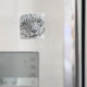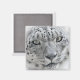 Un aimant avec une photo d'un léopard des neiges blanc qui vous regarde directement.