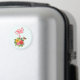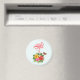 A magnet with a cute digital illustration featuring a pink flamingo with one leg raised. Standing on a bouquet of tropical hibiscus flowers and leaves. A pretty butterfly is hovering around the flowers. A light green and white chevron pattern in the background.