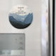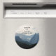 Un aimant mariage avec une photo de belles montagnes, un ciel nuageux, et des collines ondulées remplies d'arbres au premier plan. Couleur bleu gris.