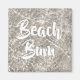 Eau gazeuse sur le sable doré de la plage. Dit "beach bum" en blanc.