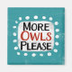 "More Owls Please" est un joli texte en bleu avec du texte en noir et rouge, avec une forme d'accent blanc et des points blancs à texture blanche.