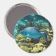 Nageant au-dessus de coraux mous, les écailles d'un poisson de récif bleu captent quelques brumes du soleil, tandis que la lumière filtre au-dessus de la surface de l'eau, tandis que d'autres poissons plus petits nagent dans l'arrière - plan.