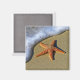 Photographie de plage frappante, une étoile de mer orange vif au bord de l'eau sur le point d'être recouverte d'une douce vague.