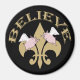 Gardez de l'espoir sur votre réfrigérateur avec cet aimant Black and Gold Fleur de Lis Flying Pigs ! Deux cochons ailés survolent une fleur de Lis en or sous le mot "Croire" sur un arrière - plan noir.