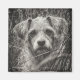 Photo de portrait noir et blanc d'un chien en sous-bois regardant directement la caméra. Grand contraste de textures, lumière et ombre.