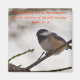 Un petit poulet gai est assis dans un arbre et appelle son nom : Chick-a-dee-dee-dee. Message : "Je connais chaque oiseau dans les montagnes, et les créatures du champ sont à moi." Psaume 50:11