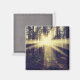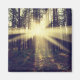 Cette photo présente une forêt de pins qui déborde de rayons de soleil.