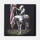 Une magnifique photo de la cowgirl sur un palomino & Paint Horse blanc tenant le drapeau américain pendant l'hymne national au Stampede de Snake River 2014.