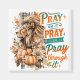 Design paisible et coloré avec une scène automne/automne avec tête de lion majestueuse, citrouilles et fleurs automne. Le texte inspirant et coloré dit : "Priez dessus, priez dessus, priez à travers". Ce design est disponible sur une grande variété de produits.