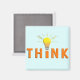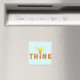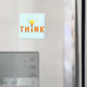 Un design simple qui dit "Pensez" avec une ampoule pointillant la lettre "I" en jaune et orange. Il y a des lignes ondulées autour de l'ampoule qui pourraient sans doute représenter les cheveux impétueux d'Albert Einstein.
