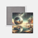 Cette sphère métallique patinée et surréaliste reflète un paysage désertique apocalyptique et baron, avec des arbres morts, le feu et la fumée.