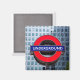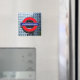 Un aimant frigo avec une image de l'emblématique panneau du métro londonien