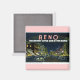 Carte postale vintage de Reno la nuit. Lumières colorées et vieilles voitures avec une police de néon rose "Reno" en haut avec "La plus grande petite ville du monde" en blanc ci-dessous. C'est une scène de Virginia Street à Reno.