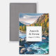 Mariage enregistrer l'aimant de date avec une photo pittoresque montrant des montagnes couvertes d'arbres aux couleurs de l'automne. Une rivière animée s'écoule autour de quelques rochers.