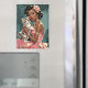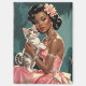 L'image représente une scène glamour d'inspiration vintage, avec une femme noire habillée d'une élégante robe rose sans paille ornée d'une délicate broderie florale. Elle respire le raffinement, accessoires d'un collier de perles multicouches, de boucles d'oreilles assorties, d'un bracelet étincelant et d'un grand anneau orné sur son doigt. Une fleur rose avec un centre orné de bijoux orne ses cheveux volumineux, de style rétro, balayés dans un updo complexe. Dans ses bras, elle tient doucement un petit chaton tabby avec un manteau rayé blanc et gris, ses grands yeux regardant vers l'extérieur. L'arrière - plan est un mur texturé, bleu turquoise, à l'allure légèrement déprimée, ajoutant une touche de contraste à l'esthétique luxueuse et féminine de la scène.