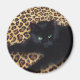 Le chat noir domine le monde depuis son tapis léopard.