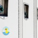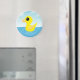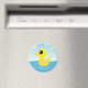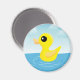 Aimant rond avec illustration de canard en caoutchouc jaune.