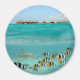 Aimant photo rond avec un requin pourchassant des papillons dans l'eau bleu clair du lagon de l'île tropicale pacifique Bora Bora de l'archipel de Tahiti Polynésie française. Au-dessus de l'eau, on aperçoit des bungalows sur l'eau.