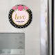 Cet aimant d'amour de mariage de rond comporte une frontière d'or de faux, un pois noir et blanc, et le mot "amour" en manuscrit. Ce magnet est une grande manière pour que les invités se rappellent votre date spéciale. Vérifiez d'autres mariage assorti/articles nuptiales dans mon magasin ici - > http://www.zazzle.com/collections/chic_black_and_white_with_pink_roses-119742500167731763?rf=238364477188679314